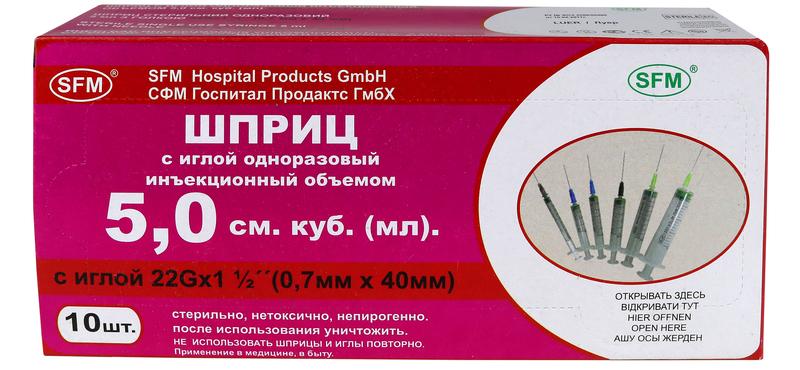 Шприц - 5мл. (3-х) SFM, Германия однораз. стер. с надетой иглой 0,70 x 40 - 22G