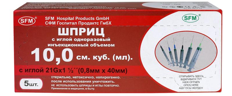Шприц 10мл. (3-х) SFM, однораз. стер. с надетой иглой 0,80 х 40 - 21G (