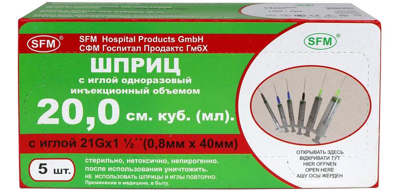 Шприц 20мл. ДВУХКОМПОНЕНТНЫЙ SFM, однораз. стер. с иглой 0,80 х 40 - 21G x 1 1/2"