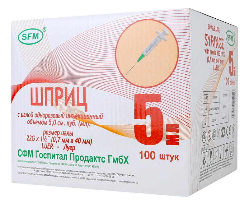 Шприц 5мл. (3-х) SFM, Германия однораз. стер. с надетой иглой 0,70 х 40 - 22G (LUER LOCK)
