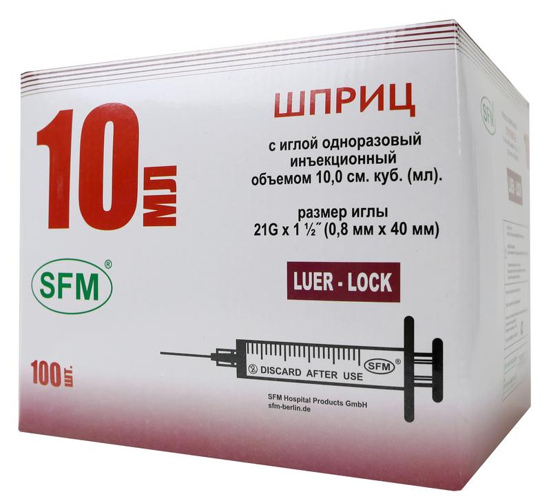 Шприц 10мл. (3-х) SFM, однораз. стер. с надетой иглой 0,80 х 40 - 21G (LUER LOCK)