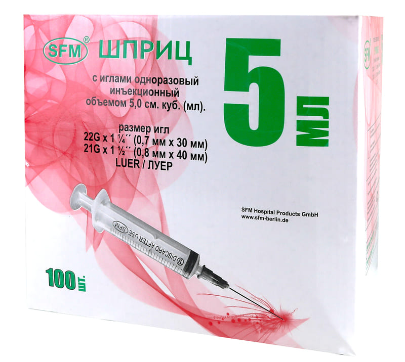 Шприц 5мл. (3-х) SFM, однораз. стер. с двумя иглами: 0,7*30 (22G) 0,8*40 (21G)"