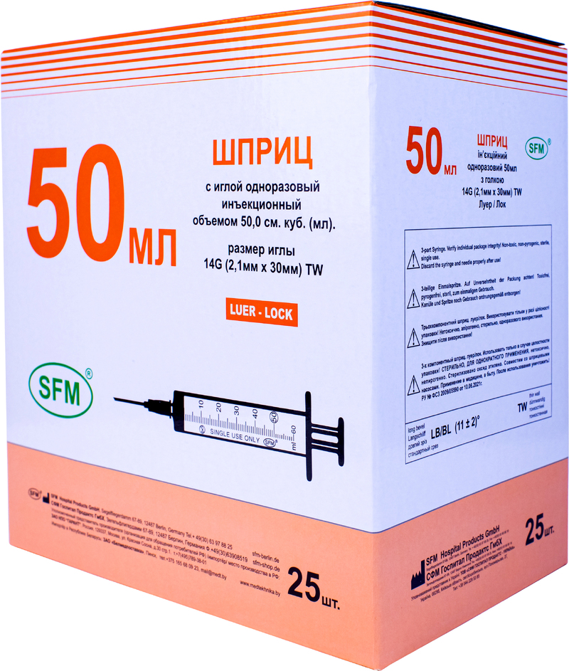 Шприц 50мл. (3-х) SFM, Германия однораз. стер. с иглой 14G (LUER LOCK) (блистер)