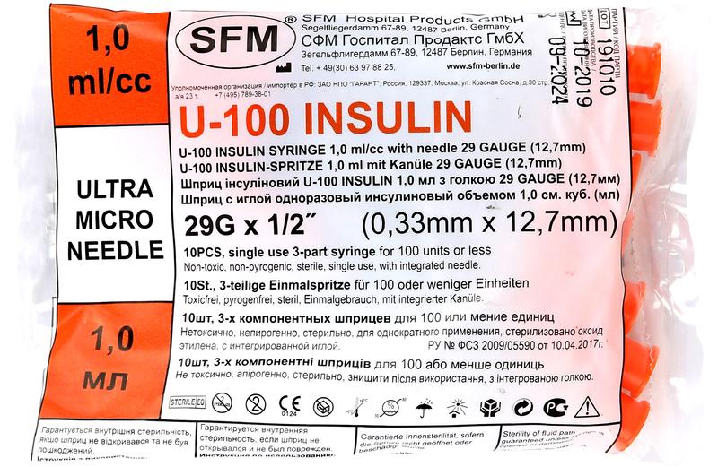 Шприц 1,0мл. Инсулин. U - 100 (3-х) SFM, Германия однораз. стер. с интегрир. иглой 0,33 х 12,7 - 29G
