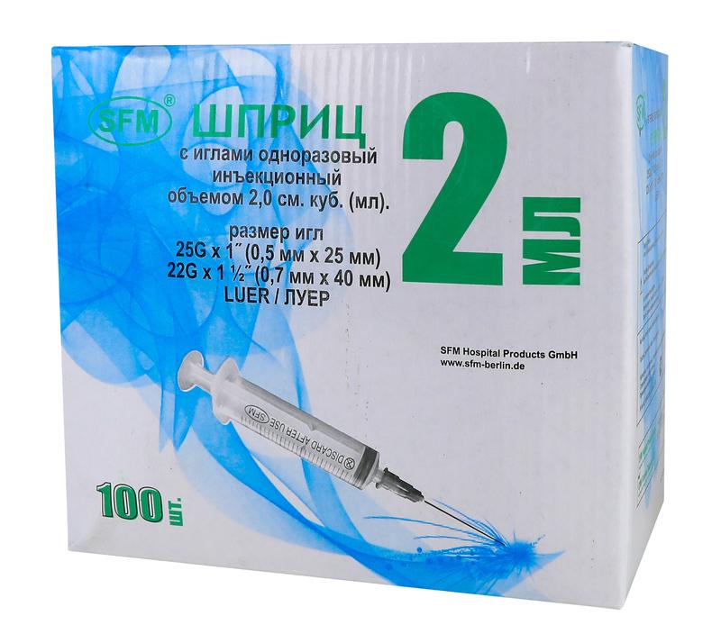 Шприц 2мл. (3-х) SFM, Германия однораз. стер. с двумя иглами: 0,5*25 (25G) 0,7*40 (22G)"
