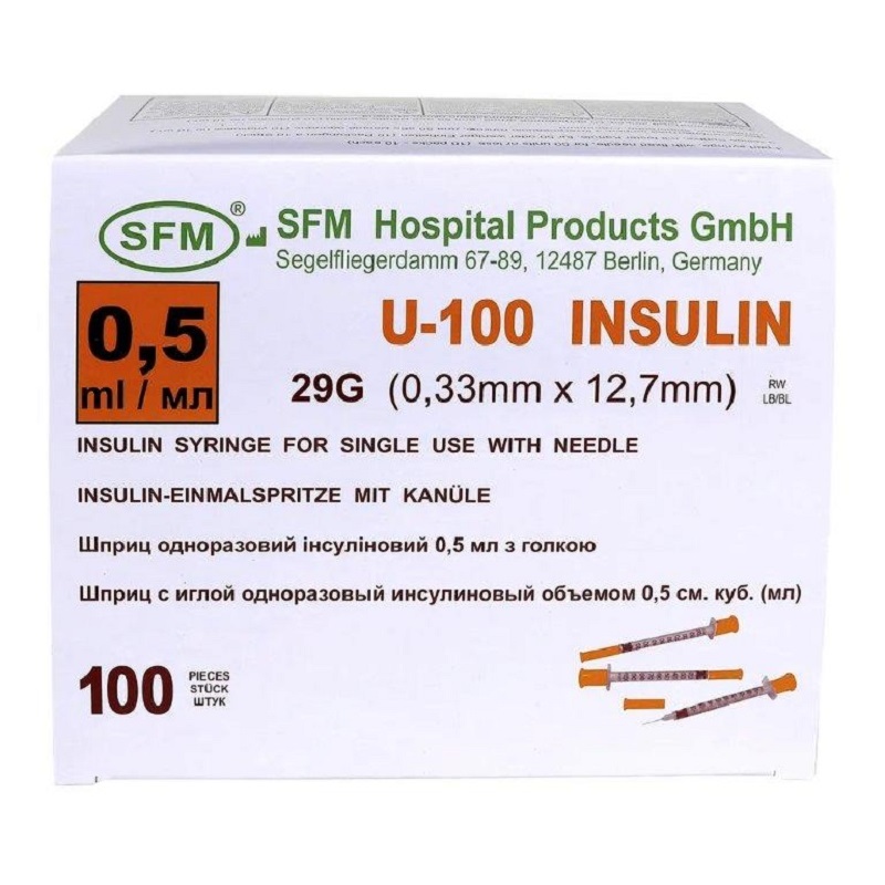Шприц 0,5мл. Инсулин. U - 100 (3-х) SFM, однораз. стер. с интегрир. иглой 0,33 х 12,7 - 29G