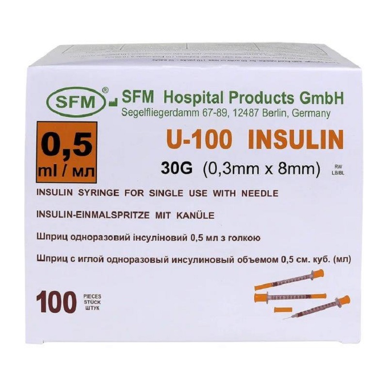 Шприц 0,5мл. Инсулин. U - 100 (3-х) SFM, однораз. стер. с интегрир. иглой 0,30 х 8,0 - 30G