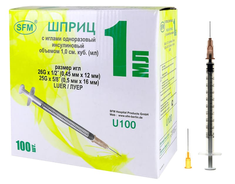 Шприц инсулиновый U-100 с интегрированной иглой применяют для инъекций инсулина.