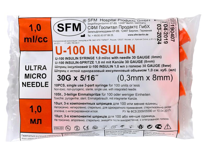 Шприц 1,0мл. Инсулин. U - 40 (3-х) SFM, однораз. стер. с интегрир. иглой 0,30 х 8,0 - 30G