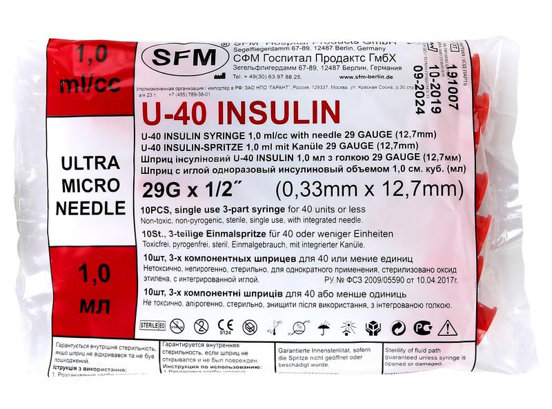 Шприц 1,0мл. Инсулин. U - 40 (3-х) SFM, Годнораз. стер. с интегрир. иглой 0,33 х 12,7 - 29G